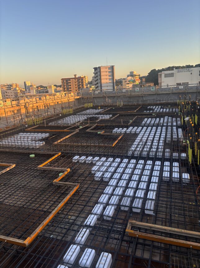 1/10~1/12・に梁配筋・1/12~1/15・からスラブ・庇及び階段配筋・ボイド取り付け後