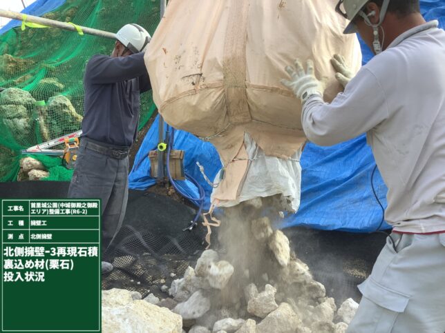 ③石材を設置後石材が動かないように栗石を設置していきます。