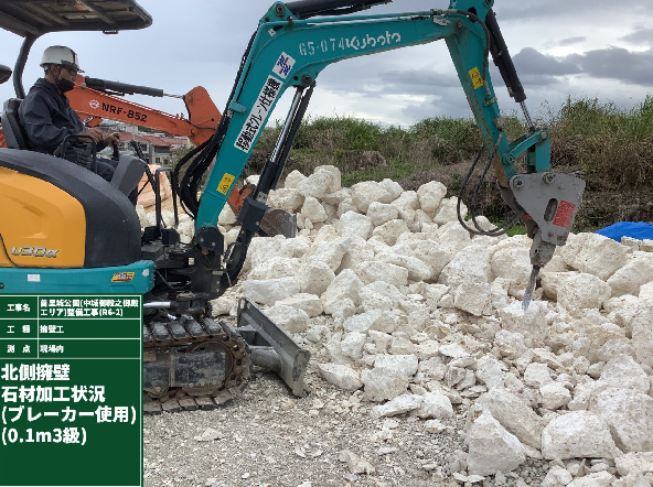 ①番線などで石の形をとりその形に合うようにチッパーとういう工具とバックホウのブレーカーで削っていきます。