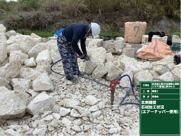 ①番線などで石の形をとりその形に合うようにチッパーとういう工具とバックホウのブレーカーで削っていきます。