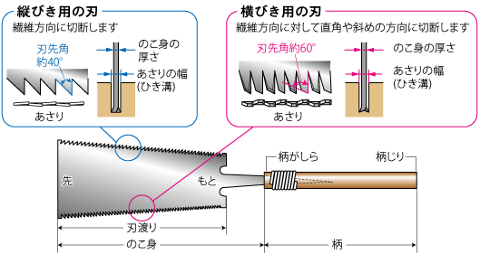 木材を切る方向によって刃が違ってきますので両刃のこぎりがお勧めです。木目に沿って刃を入れるタテ挽き、もう片方は木目に対して直角に切るヨコ挽きになっています。