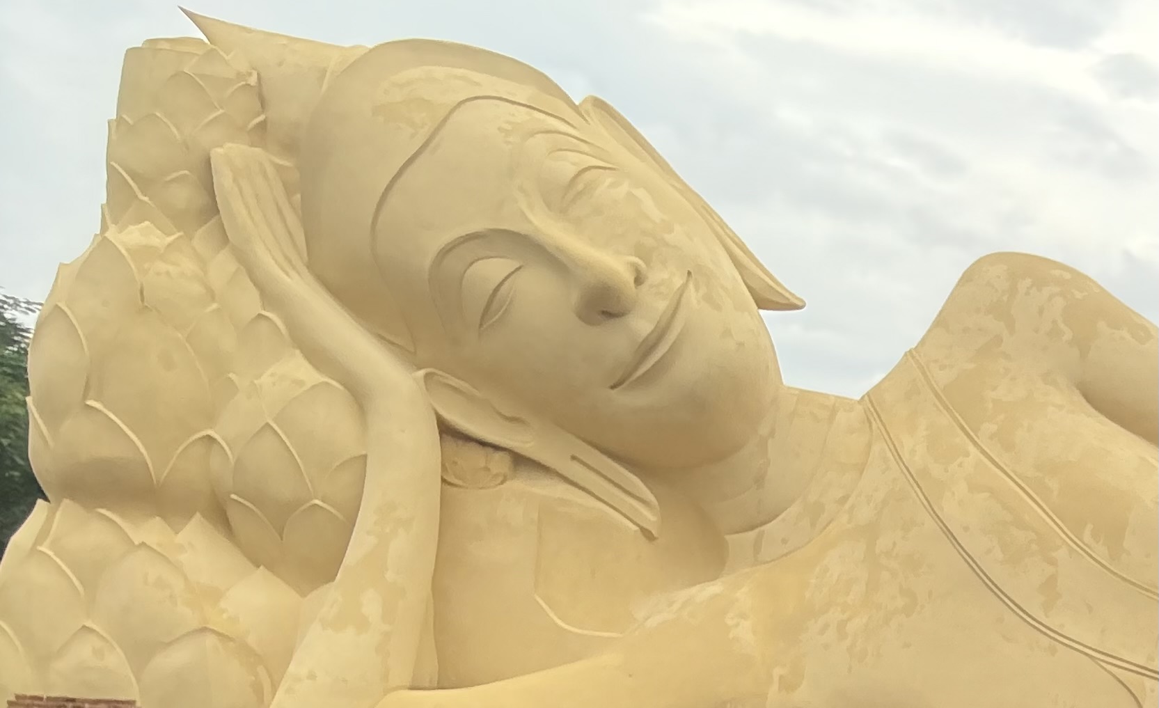 広大な草原に悠々と寝そべる高さ5m、全長28mの巨大寝釈迦仏です。