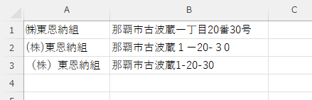 B列に入力されている住所を全角に変換し統一します。