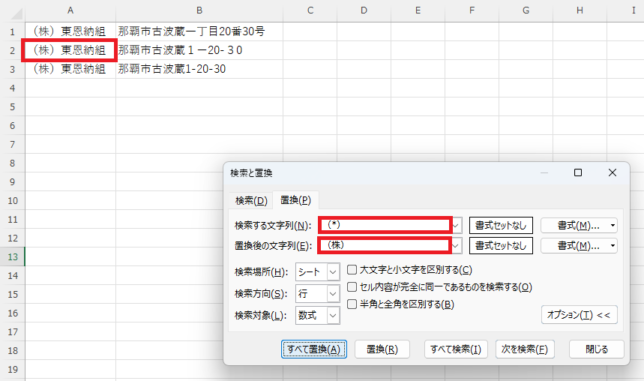 置換後の文字列に「(株)」