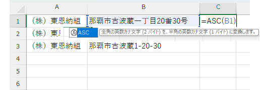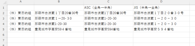 B列に入力されている住所を半角に変換し統一します。