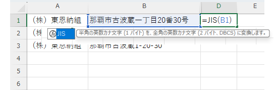 作業列として、D列に「=JIS(対象セル)」と入力していきます。