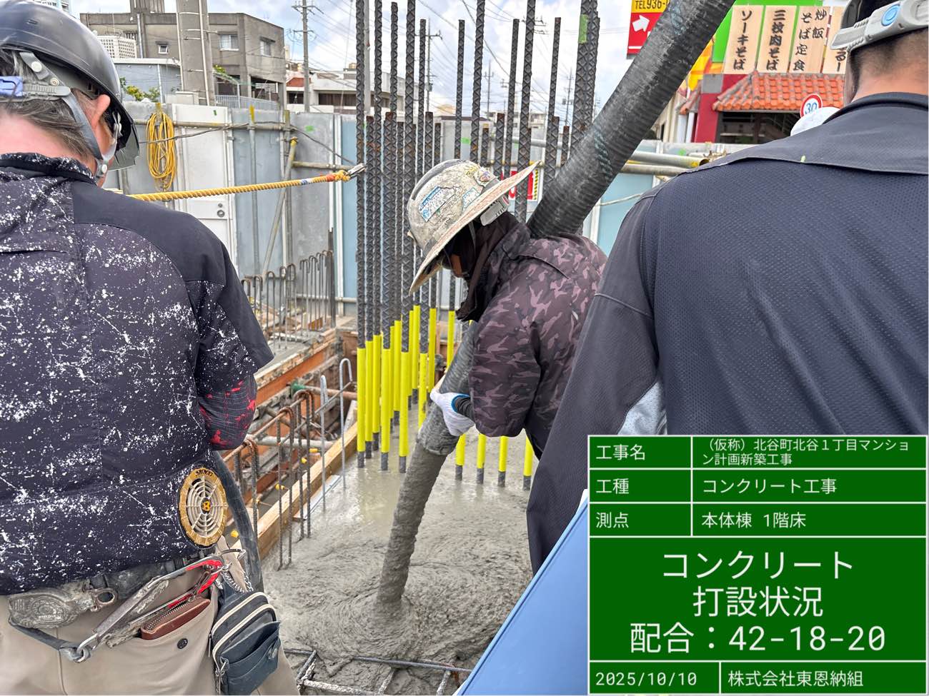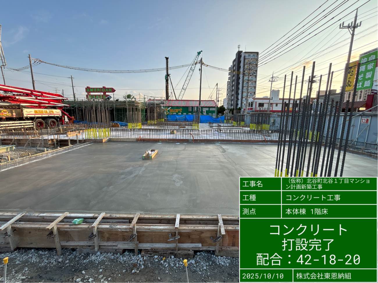 配属されている「北谷1丁目マンション計画」では、10月10日(金)に1階床のコンクリート打設を行いました。