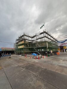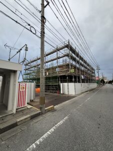 台風26号の、影響で強風対策の為外部足場のメッシュシートを巻いていますが、近日中に復旧予定です。
