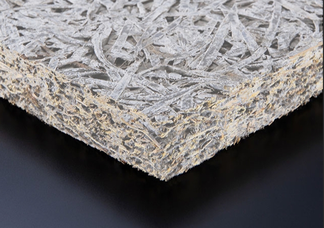 木材のしなやかさとセメントの強度をあわせ持つ複合素材で、表面には木の繊維がランダムに絡み合った独特の模様や、その素朴で