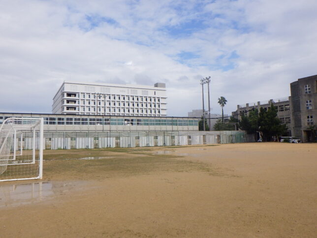 ↓現在は運動場に仮設プレハブ校舎を建てて、授業を行っています。(2階建て)