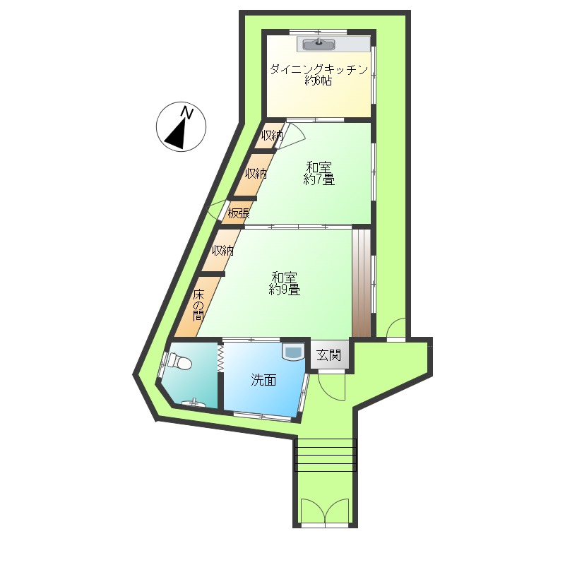 和室2つとキッチンがあり、和室の収納が斜めになっているのがこの物件の大きな特徴の一つです