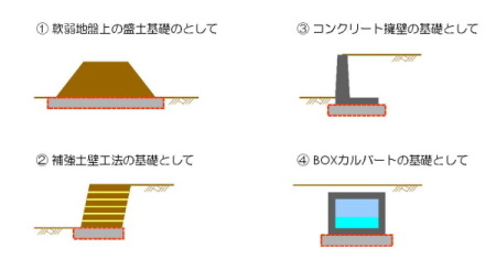 荷重を広い範囲に伝えることで、不等沈下を抑え、構造物の安定性を高めることができます。主に擁壁基礎、道路盛土、河川堤防などで活用されています。