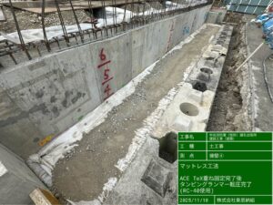 さて、今現在私が携わっている現場では擁壁を施工するにあたって擁壁の下にマットレス工法という軟弱地盤の補強する地盤改良を行っています。